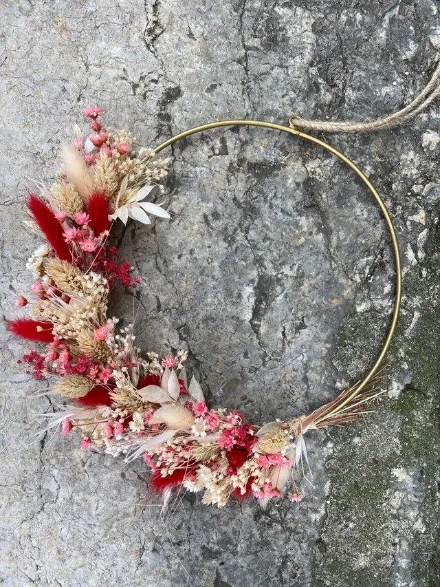 Couronne de fleurs séchées (teintes naturelles, roses et pourpres)